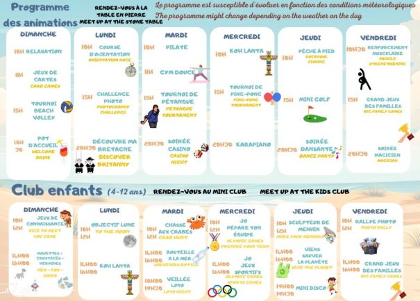 • Camping de la Plage is a member of the Family Club of the Comité Régional de Bretagne. This participation led us to privilege, with our activities staff, children's clubs, to encourage parents to also participate and to offer shows and activities for all in the evening. In order to respect the campsite tranquility, they end at the latest at 11 pm. As for those who like to party, the lively resort of Carnac-Plage is only 4 km away.