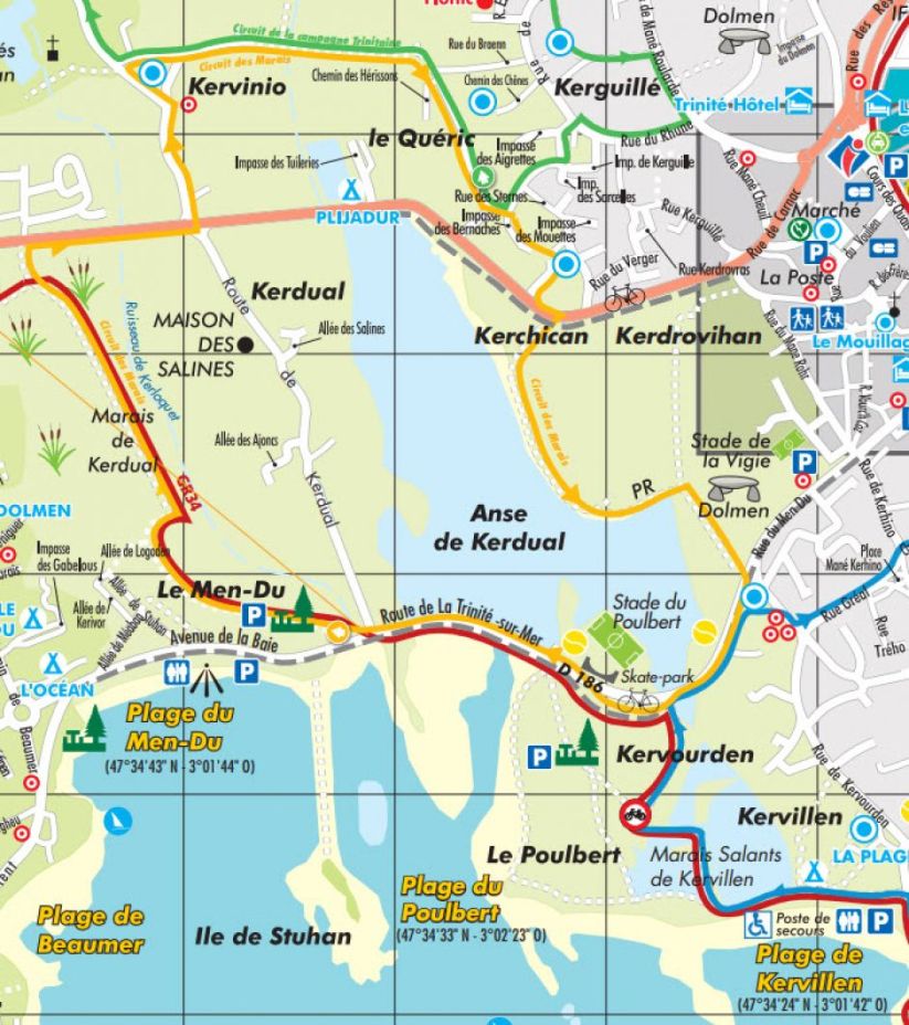 Continuing the coastal path, this circuit links La Trinité sur Mer with Carnac...It follows the beaches of Le Poulbert and Le Men-dû then crosses the marshes of Kerdual. It is a very nice walk, accessible for all, that has you discover preserved natural environments, and also the local man-made heritage : traditionnal villages, public wash basins and fountains, salt marshes and salt warehouses...